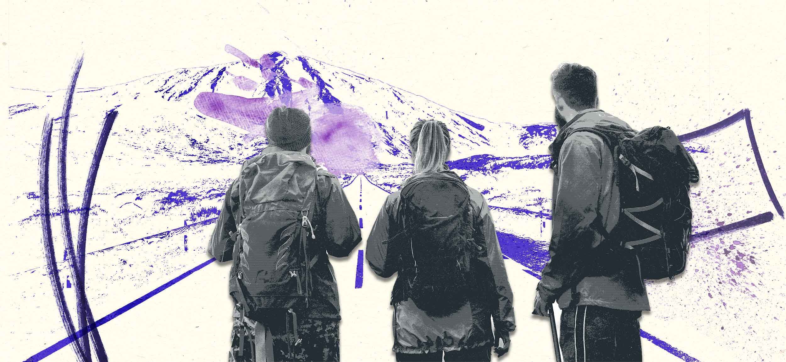 Zu sehen sind drei junge Menschen auf dem Weg zu einem Berggipfel im Hintergrund des Bildes.