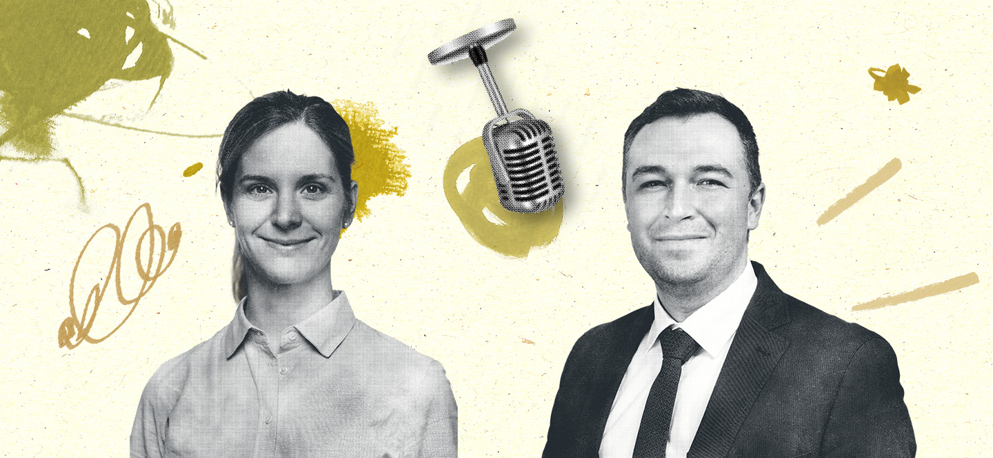 Illu mit zwei Personen, im Hintergrund ein Mikrofon